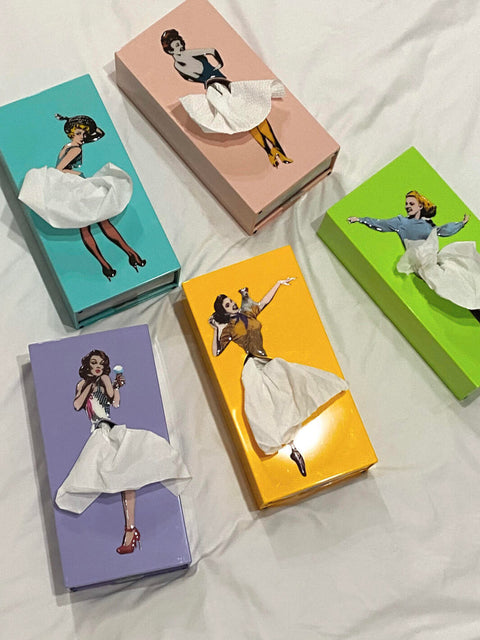 Lasciatevi incantare dalle scatole colorate e dal fascino di queste giovani signore. I fazzoletti sono risate, buonumore e colore in un unico oggetto. È tutto ciò di cui avete bisogno per aggiungere morbidezza alla vostra casa!