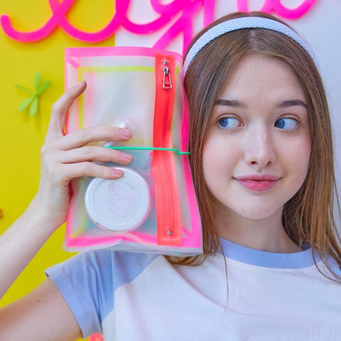 I colori neon allegri e i messaggi motivanti come "RISEUP" e "MYLOVE" ti faranno sentire sempre positivo durante il tuo viaggio. Inoltre, il design trasparente ti permette di vedere facilmente cosa c'è all'interno, rendendo l'organizzazione ancora più semplice.