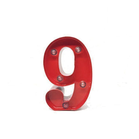 Pusher Mini Las Vegas light up decorations for the home, number 9, metal, red. Battery operated: 3 x RL44 included On/Off button and predisposition to hang it also on the wall. For internal use only.