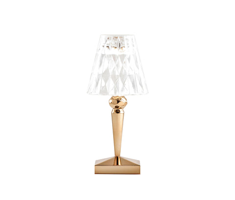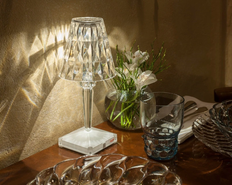Battery is the iconic abat-jour with small dimensions, made of transparent PMMA, whose great innovation is given by the fact that it is 100% rechargeable via a simple electric plug and can have an autonomy of up to 8 hours. This allows it to be moved very easily: therefore ideal for contract use, for use in outdoor cafes or restaurants. Battery presents a crystal colored hat with a faceted surface that offers enchanting plays of light and a structure available in three different refined metal colours.