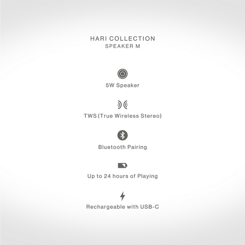 L'altoparlante HARI Collection M è la perfetta combinazione di design innovativo e suono cristallino, presentato in un raffinato colore oro chiaro. Con una potenza di 5 W, offre un'esperienza audio di alta qualità, arricchita dalla tecnologia stereo wireless (TWS) che permette di godere di un suono stereo avvolgente senza fili.