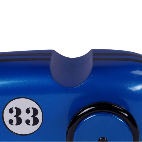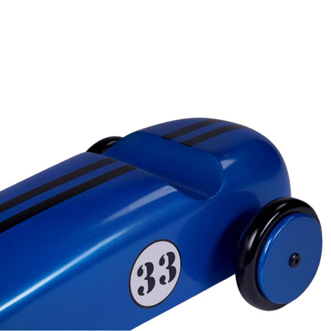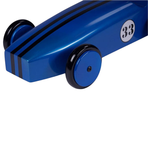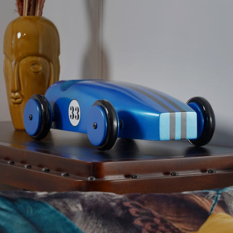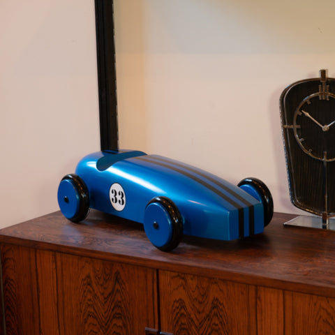 Descrizione Prodotto: Scopri la nostra macchinina in mogano massiccio, un capolavoro di artigianato che celebra la bellezza del legno e l'eleganza del design vintage. Questa replica di un'auto da corsa degli anni '30 è realizzata a mano con cura e passione, utilizzando legno di mogano massiccio e una finitura laccata metallizzata blu di altissima qualità.
