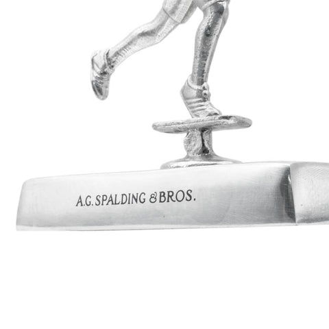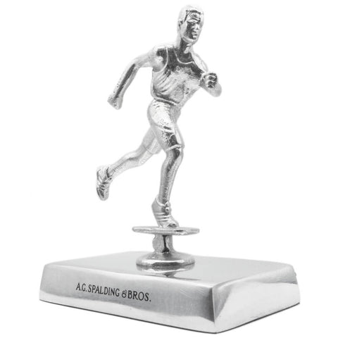 Fermacarte o soprammobile firmato spalding, realizzato con l’antico sistema di fusione a terra in alluminio, rappresentato corritore dalla texture lucida, piattaforma con brand logo inciso.
