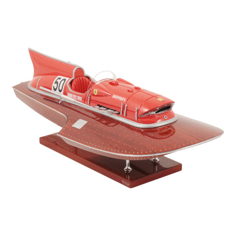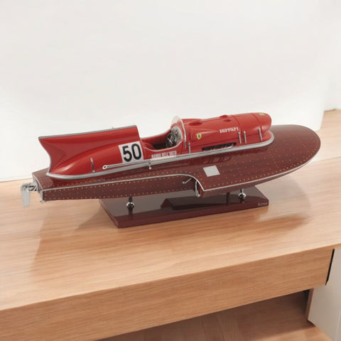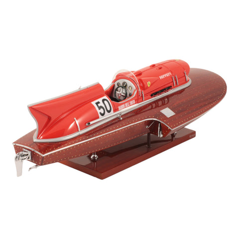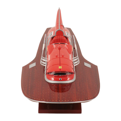 Questo straordinario modello, lungo 50 cm, è una replica fedele dell'idrovolante che ha stabilito un record mondiale di velocità nel 1953. Realizzato interamente a mano con materiali pregiati come il legno e l'ottone cromato, ogni dettaglio è curato con maestria per offrirti un'esperienza visiva unica.