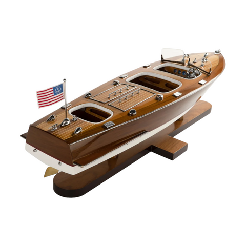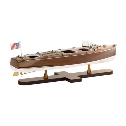Dalla collezione di Authentic Models, il Triple Cockpit, riproduzione fedele del veloce motoscafo bimotore. Mogano scintillante, sedili imbottiti di vera pelle pregiata e finiture cromate.