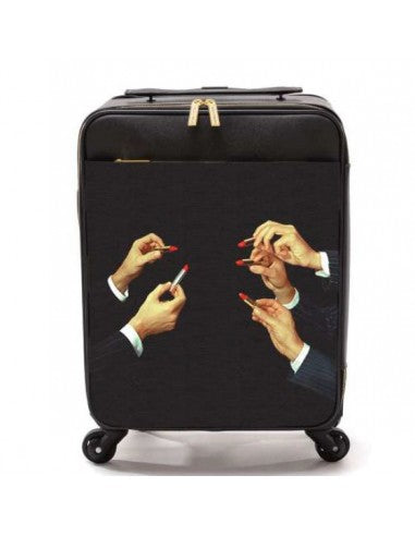Trolley Regimental Seletti by Toiletpaper is the travel trolley signed Toiletpaper Home with an irreverent and provocative optical print, it is a stylish accessory to accompany you comfortably while you go shopping or on your way to work, thanks to the capacity and practicality of its volumes, equipped with handles and 4 wheels to transport it anywhere without fatigue. Can be combined with the shopping bag and the Travel Bag Seagirl.